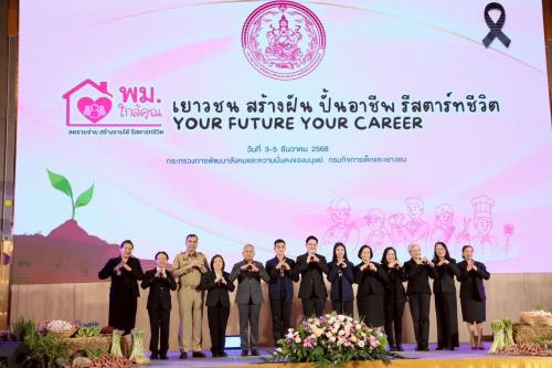 🔖 วันพุธที่ 3 ธันวาคม พ.ศ. 2568 เวลา 13.30 น. นายอัครา พรหมเผ่า รัฐมนตรีว่าการกระทรวงการพัฒนาสังคมและความมั่นคงของมนุษย์ เป็นประธานในพิธี Kick Off โครงการ “เยาวชนสร้างฝัน ปั้นอาชีพ รีสตาร์ทชีวิต (Your Future Your Career)” เพื่อสร้างแกนนำเยาวชนที่มีความคิดสร้างสรรค์ มีทักษะอาชีพ สามารถสร้างรายได้ ลดรายจ่าย และพึ่งพาตนเองได้อย่างยั่งยืน พร้อมปลูกฝังจิตสาธารณะให้เยาวชนมีส่วนร่วมในการอนุรักษ์ พัฒนา และต่อยอดผลิตภัณฑ์ในชุมชน ส่งเสริมการทำงานร่วมกับเครือข่าย รวมทั้งสามารถถ่ายทอดองค์ความรู้แก่เยาวชนในพื้นที่ได้ ภายในงานมีการเสวนาในหัวข้อ “การพัฒนาเด็กและเยาวชนด้านอาชีพ” และการแบ่งกลุ่มวิเคราะห์เป้าหมายชีวิตและทิศทางการพัฒนาอาชีพของเด็กและเยาวชน รวมถึงการ Matching อาชีพร่วมกับศูนย์เรียนรู้การพัฒนาสตรีและครอบครัว เพื่อจัดหาหลักสูตรการเรียนรู้ให้แก่แกนนำเด็กและเยาวชน กลุ่มเป้าหมายประกอบด้วยแกนนำสภาเด็กและเยาวชน รวมถึงผู้ปฏิบัติงานด้านเด็กและเยาวชน รวมทั้งสิ้น 579 คน